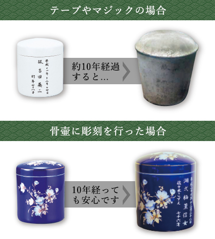 お墓のカロート(骨壷を納める場所です)は湿度が高く、従来の骨壷に記されたテープやマジックでは、時間の経過と共に劣化して消えてしまい、どなた様の骨壷が安置されているのかをご確認する事が困難になります。